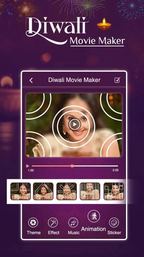 Aplikasi Happy Diwali Movie Maker melalui Anda membuat video Diwali Anda sendiri.