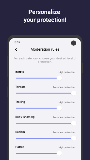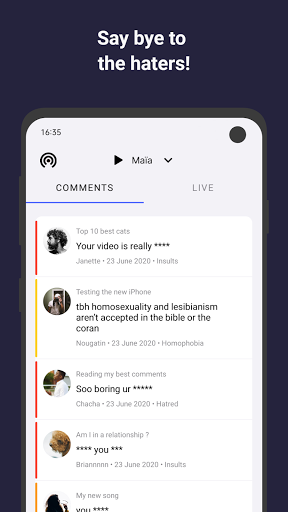 Aplikasi seluler gratis yang melindungi Anda dari cyberbullying, kebencian, dan konten beracun di YouTube, Instagram, Twitter, dan Twitch!Cukup masuk menggunakan akun media sosial yang Anda inginkan secara real time, 24/7 dalam bahasa Inggris, Prancis dan Italia.