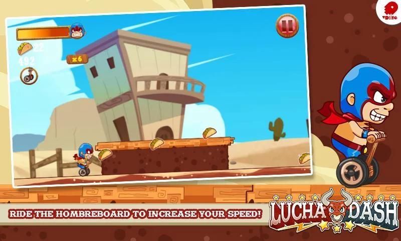 Kumpulkan Tacos sepanjang jalan untuk mengisi bar kekuatan Anda. Menggunakan kekuatan Dash Lucha Anda untuk meningkatkan kecepatan Anda dan istirahat mereka obsatcles.