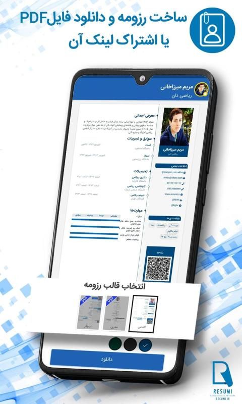 - ساخت قدرتمند ترین رزومه : مشخصات شخصی خود را ایجاد و مهارت خود را برجسته کنید همراه با امکان دانلود و ارسال