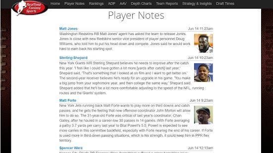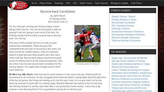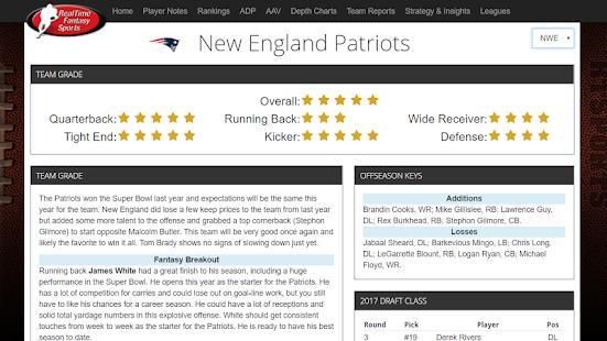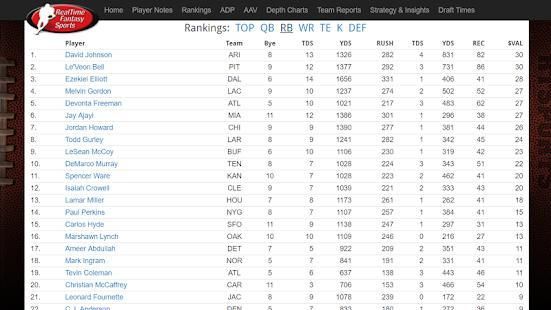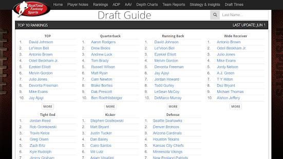 Sebuah bebas 2018 fantasi sepak bola rancangan panduan, dengan update berita, melanggar pemberitahuan berita, catatan pemain, dan analisis serta peringkat ahli, ADP, dan nilai-nilai lelang. Semua informasi diperbarui setiap hari oleh RealTime Fantasy Sports.