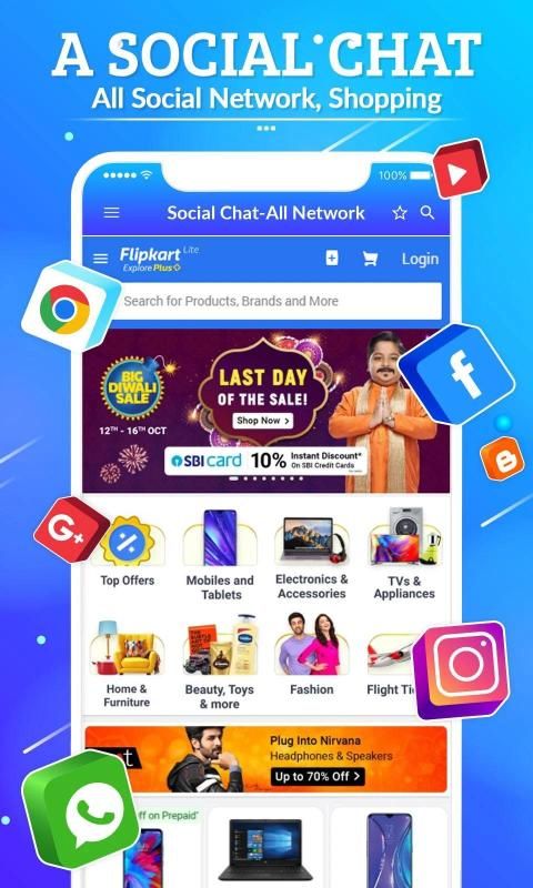aplikasi menyediakan akses mudah ke semua jejaring sosial yaitu: Facebook, Twitter, Instagram, Snapchat, whatsapp dan banyak lagi.