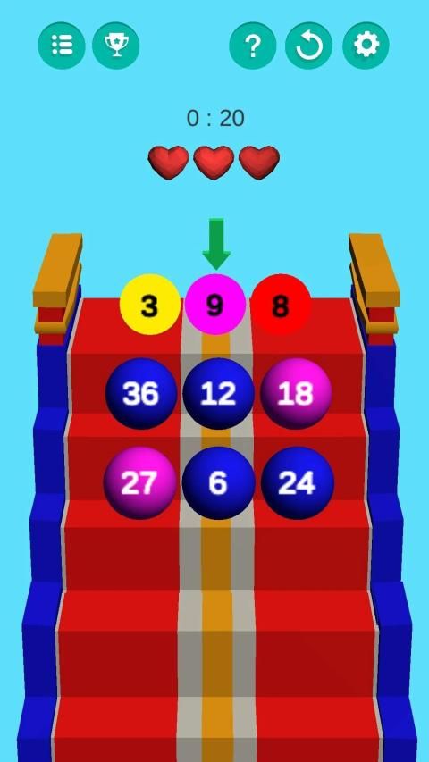 Ini adalah permainan sederhana di mana Anda perlu menemukan beberapa angka, yaitu angka yang dapat dibagi sepenuhnya oleh pembagi saat ini yang ditunjukkan pada bola, yang ditandai dengan panah hijau. Untuk melewati level, Anda harus menemukan semua dividen yang cocok untuk masing-masing pembagi pada gilirannya. Kemudian Anda dapat naik ke level berikutnya melalui menu. Game ini dapat membantu melatih ingatan Anda dan akan sangat berguna bagi anak-anak yang mulai belajar pembagian di sekolah.