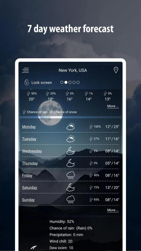 - Menampilkan suhu saat ini, perkiraan harian dan jam, waktu matahari terbit dan terbenam, kelembaban, kecepatan angin, tekanan udara dan indeks UV.