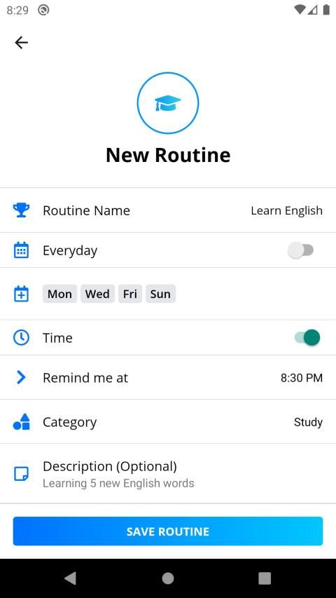 RoutineGoal memungkinkan Anda mengatur pengingat yang mengingatkan Anda untuk menyelesaikan rutinitas sehari-hari Anda.