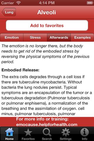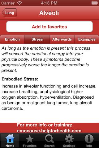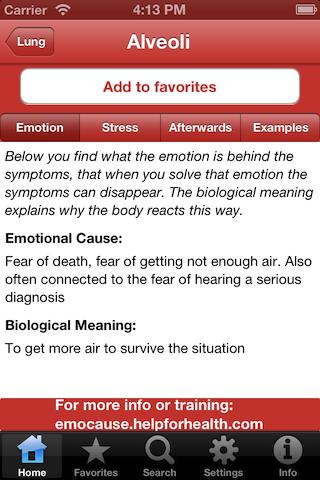 Pelajari penyebab emosional dari penyakit apa pun dengan cepat dan mudah dengan aplikasi ini. Cukup pilih tisu dengan masalah dan masalah emosional Anda akan ditampilkan. Seringkali masalah emosional ini adalah tema utama yang berjalan dalam hidup Anda. Jadi ketika Anda mengatasi ini, Anda akan membuat lompatan kuantum dalam pengembangan pribadi Anda.