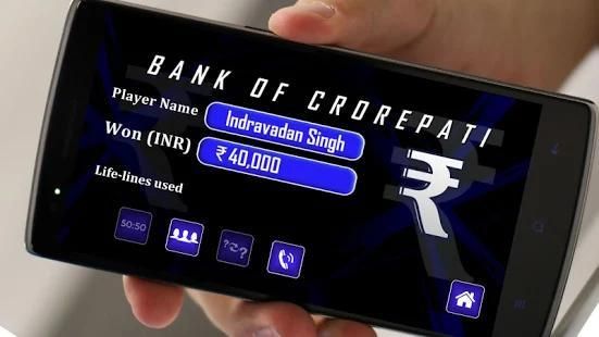 > Life Lines: In first life line you can flip the question and different question will be appeared. In second life line you can remove 2 wrong answers and can choose one right answer from 2. Thirdlife line is Call a friend, here you can call and can take your friend's help. (Here we will help to give you the correct answer if you are lucky) and the last one is audience poll where audiencewill give their opinion on the answer. So there is an MCQ (Multiple choice question) related to GK, English or current affairs in India or world.