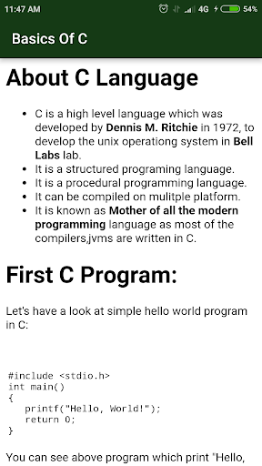 L'applicazione della lingua C aiuta a imparare c in modo molto semplice.Scopo di questa app è quello di fornire contenuti semplici e logici agli utenti che aiutano gli utenti a imparare facilmente la lingua C.Questa app contiene: