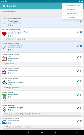 - Postpone, cambia gruppo, eliminare o archiviare tutti gli eventi trovati o controllati;