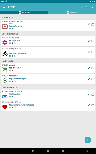 La domanda dei miei eventi è un'ottima alternativa al tuo calendario di lavoro. È possibile creare eventi, promemoria e orari nell'app. Creando eventi, puoi facilmente pianificare attività e riunioni. Puoi ricevere promemoria di eventi imminenti, archiviare gli eventi completati e vedere eventi importanti nel tempo. I promemoria e gli orari aiutano anche a pianificare un'agenda, ma non sono archiviati. Il promemoria ha lo scopo di ricordarti un evento imminente in un momento programmato. Il calendario è progettato per memorizzare eventi che sono costantemente ripetitivi.