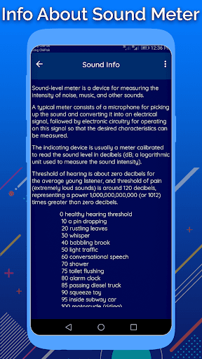 Stai cercando uno strumento per misurare il livello del suono e misurare il rumore ambientale? Sound Meter: Decibel Meter è un'app gratuita per rilevare il suono e misurare il suo valore decibel (valore DB). Meter Sound Meter DB Il rilevatore di rumore utilizza il telefono Microfono integrato per misurare il suono in Decibel e visualizzarlo anche nel grafico semplice. Rilevatore audio è anche chiamato misuratore acustico o metro Decibel (DB Meter). Attraverso il rilevatore audio o il rilevatore di rumore è possibile rilevare facilmente suoni molto rumorosi o suoni molto bassi per proteggere la funzionalità dell'udito da suoni troppo bassi o da suoni troppo forti.