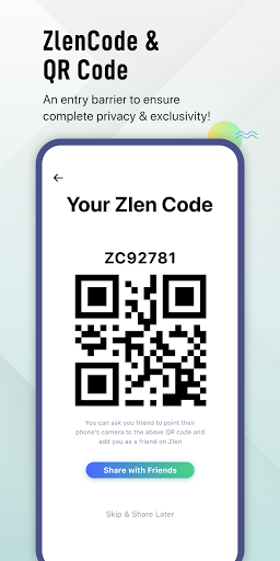 Ottieni un codice profilo alfanumerico unico - 'zlencode' assegnato esclusivamente a te! È solo con questo codice Chiunque può inviare una richiesta di essere nella tua lista di amici / chat room. Puoi scegliere di accettare o rifiutare la richiesta. Tutto quello che possiamo dire è che il tuo amico deve guadagnare il tuo zlencode per essere nella tua esclusiva bolla sociale! Puoi aggiungere il tuo compagno tramite il codice QR che è il modo istantaneo di connettersi quando sei insieme.