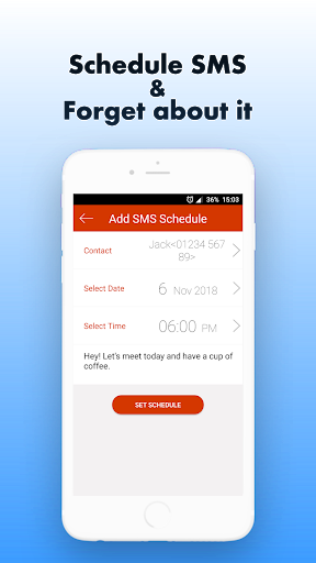 Non ci sono altri ricordi necessari, non perdere mai compleanni, anniversari, auguri per vacanze, incontri importanti e occasioni.Semplicemente impostare la data e l'ora e lascia il riposo sul tuo telefono per inviare SMS per te.SMS verrebbe inviato automaticamente senza alcun intervento dell'utente.