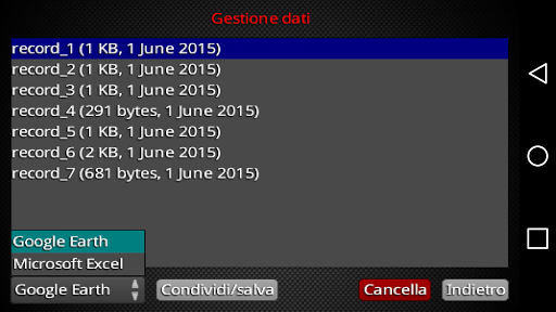 Con GeeMeter puoi registrare e condividere le tue prestazioni in formato kmz (Google Earth) o xls (Microsoft Excel).