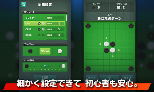 強いCPUから弱いCPUまで設定して、黒か白を選択してから対局することができます。