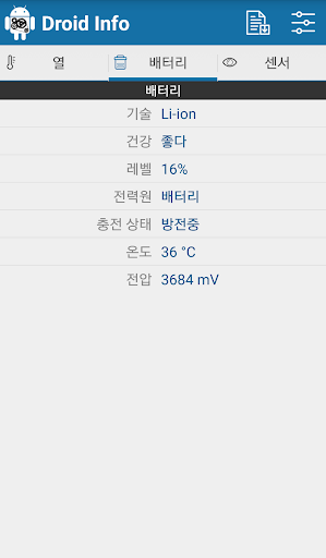 -배터리: 배터리 양, 현재 사용량, 전력원, 온도 그리고 볼트