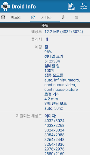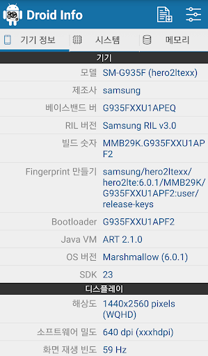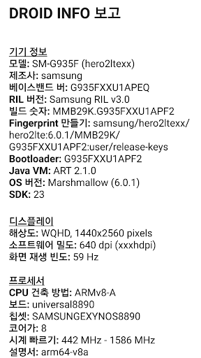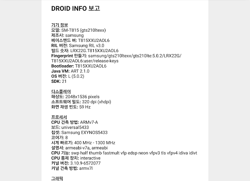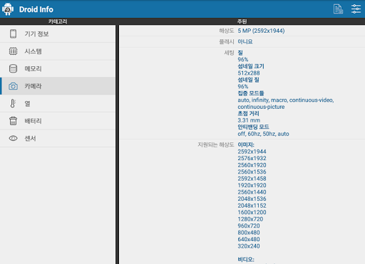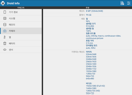 Droid Info는 당신의 안드로이드 스마트폰의 하드웨어를 위한 앱입니다. 이 앱을 사용하면 당신의 스마트폰의 기기 정보, 시스템, 메모리, 카메라 정보, 온도, 배터리 그리고 센서에 대한 상세한 정보를 제공합니다. 당신의 스마트폰에 대해서 자세한 보고를 받을 수도 있습니다.