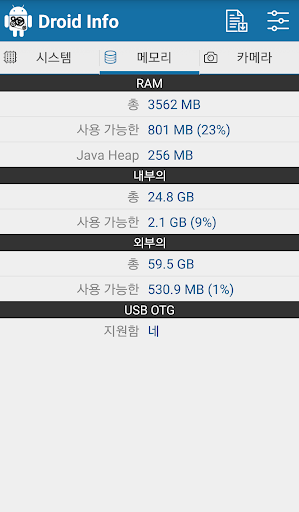 -메모리: 총 랩 용량과 사용 가능한 양 그리고 당신의 기기의 보관기간 정보