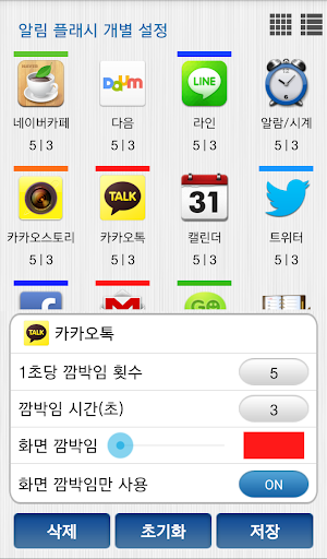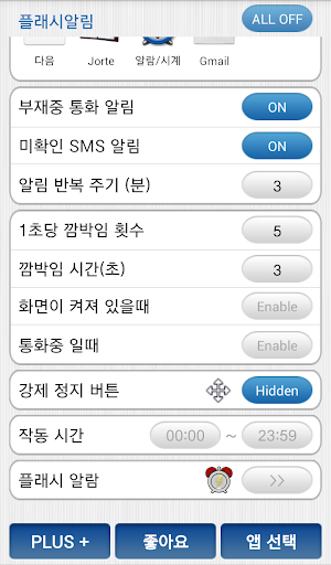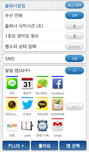 - 선택한 앱(카카오톡, 알람/시계, 트위터, 이메일 등)에서 새로운 알림 메세지가 오면 플래시가 깜박임