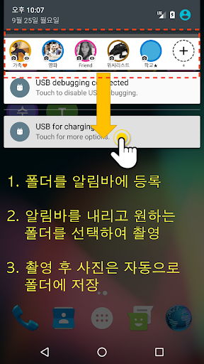 스마트폰의 알림바(상태바/상단바)에 분류하고자 하는 폴더를 미리 연결해두고 폰에 내장된 기본 카메라 앱을 이용하여 사진을 촬영해 폴더에 바로 저장을 하도록 도와주는 앱입니다.