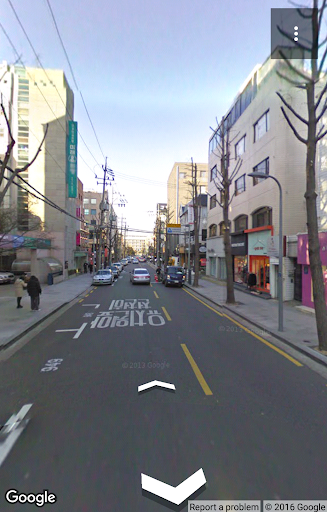 - 스트리트 뷰를 볼 수 있습니다. 위치 아이콘이 표시된 지점이나, 아이콘으로 표시된 지점이 없는 경우 화면의 중앙 지점이 선택됩니다. (스트리트 뷰가 제공되지 않는 지점이 선택된 경우 검은 화면이 나옵니다.)