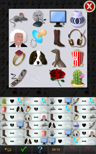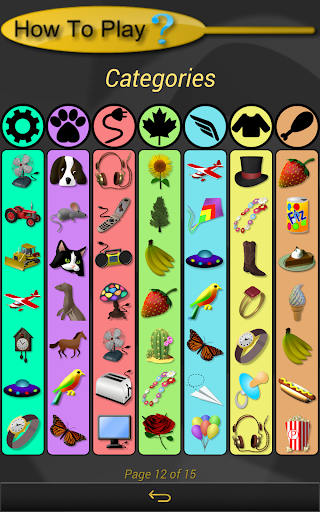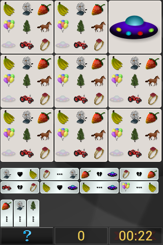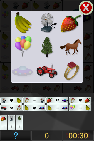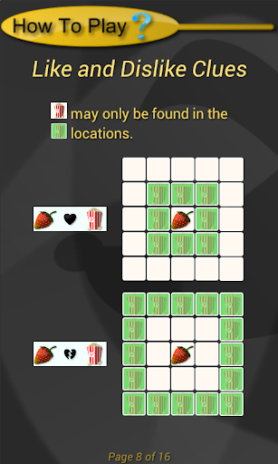 The game consists of a game board, a variety of images, and clues. Each square on the game board shows a small version of each image. Using the clues provided, and your powers of deduction, prune images from each square by tapping once on the square to enlarge it, and then again on the image to be removed. Continue this process until only one image remains in each square. If they're all in the correct square, you WIN!!