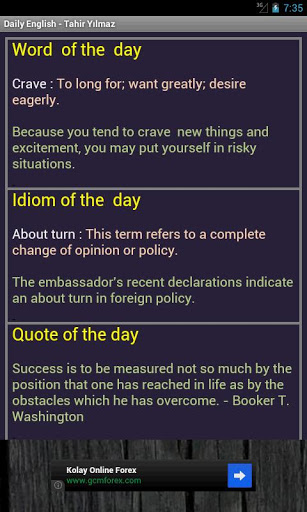 Daily English is a nice and easy-to-use application. Daily English includes, words, phrasal verbs, idioms, quotes, fascinating facts, proverbs, jokes and quizes, which we think will help you boost your English. Daily English will be updated daily and more sections will be added in future versions of daily english.