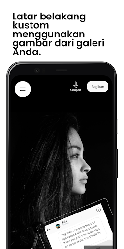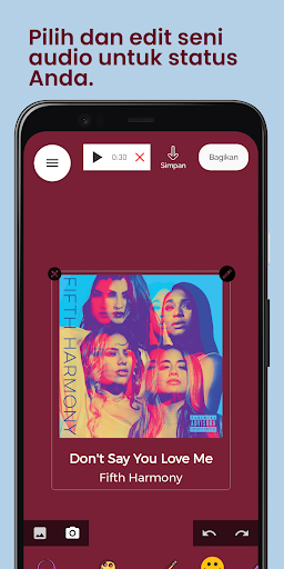 Pernahkah anda berharap dapat dengan mudah menyiarkan bahagian -bahagian lagu atau audio yang anda fikir adalah luar biasa.Sekarang pembuat status audio membolehkan anda melakukannya.Dengan pembuat status audio, anda boleh memilih atau merakam audio dari perpustakaan anda, potong audio untuk memilih bahagian yang anda ingin kongsi, kemudian ubah menjadi status audio dengan memilih dari beberapa pilihan latar belakang yang tersedia dalam aplikasi atau menggunakan imej tersuai itu sendiri sebagai latar belakang.Anda kemudian boleh memamerkan kreativiti anda dengan menambah teks, pelekat, penapis, atau imej di atas status anda untuk memberikan kelebihan tambahan.Anda boleh berkongsi status ini di WhatsApp atau platform media sosial yang lain dan akan berjaya!Cuba.Melalui hari -hari ketika anda perlu menutup kamera hanya untuk menyiarkan anda menyanyi. **************************************************** *********************** ******************** Media sosial yang popular.Ini memberi anda beberapa pilihan pelarasan untuk memamerkan kreativiti anda.Anda boleh menggunakan audio anda sendiri dari perpustakaan anda atau perakam suara kualiti tinggi anda untuk membuat status audio anda. Anda.Menyokong banyak format audio popular seperti MP3, AMR, WAV, dan M4A.Ini termasuk audio dan visual audio -default pemangkasan dengan lima tahap pembesaran yang berbeza yang membolehkan anda memilih mana -mana bahagian audio anda untuk membuat status anda. Menakjubkan dengan memilih dari beberapa fon yang indah yang terdapat dalam aplikasi.Anda kemudian boleh memilih untuk menggabungkan status teks anda dengan audio atau hanya menyiarkannya seperti itu.Juga membolehkan anda membuat status menggunakan imej tersuai anda sendiri dari galeri atau kamera sebagai latar belakang.Ini memberi anda beberapa penapis hidup untuk meningkatkan imej anda dan juga menyediakan alat berus yang boleh anda gunakan untuk menarik imej anda.