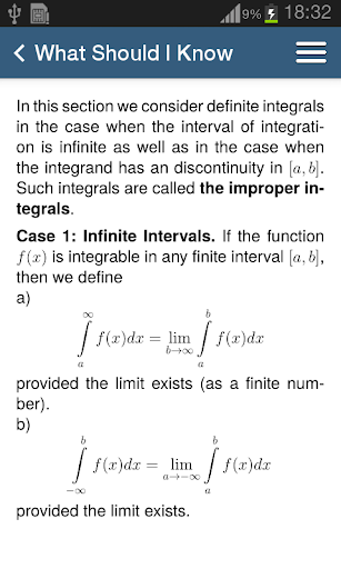 Math includes a button called ”What Should I Know”. The page under this button contains a brief summary of definitions and theorems as well as formulas necessary for solving the problems.