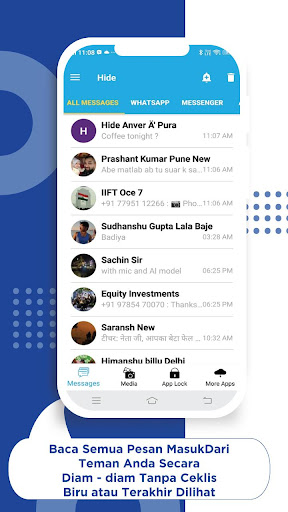 - Baca mesej perbualan dengan senyap dan dalam mod penyamaran. Foto, Video, dan audio anda tanpa meninggalkan senarai semak biru berganda