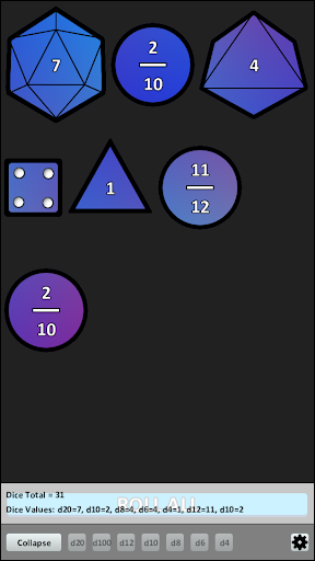 • Dice sisi yang tersedia: D20, D100, D12, D10, D8, D6, D4