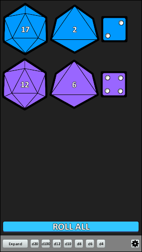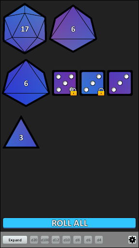 Berinteraksi dengan dadu anda dengan menekan butang Roll semua, Flicking Dice anda, atau goncangkan telefon anda untuk menggulung mereka semua.