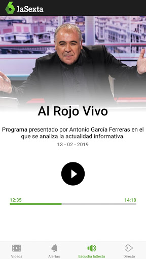 Termasuk kebahagiaan mendengar program La Sexta secara langsung. Kami menawarkan audio supaya anda, semasa bersukan atau memandu di dalam kereta, anda dapat mendengar Al Rojo Vivo, Salvados, Zapeando, laSexta Noticias…