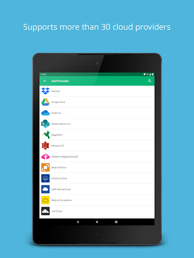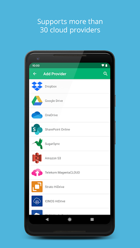 - Menyokong kebanyakan penyedia penyimpanan awan seperti Dropbox, Google Drive atau Microsoft OneDrive. Lihat di bawah untuk senarai lengkap penyedia yang disokong