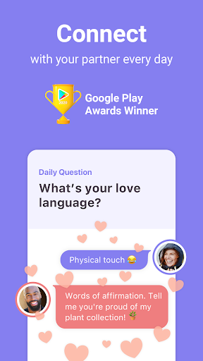 Dengan ciri soalan harian kami, anda mendapat soalan yang menyeronokkan untuk menjawab setiap hari antara anda dan pasangan anda. Setiap soalan datang dengan fakta berasaskan penyelidikan mengapa menjawabnya akan membantu hubungan anda, dan hanya dengan menjawab soalan sendiri, anda boleh membuka kunci jawapan pasangan anda! Soalan dikumpulkan ke dalam dek kad supaya anda boleh memilih topik yang paling relevan untuk anda. Setiap minggu kuiz adalah aspek yang berbeza dari hubungan anda, dan apabila pasangan anda menjawab kuiz, anda akan dapat membandingkan jawapan.