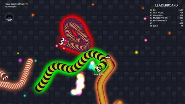 Watch out - if your head touches another snake, you will explode and then it's game over. But if you get other snakes to run into YOU, then THEY will explode and you can eat their remains!