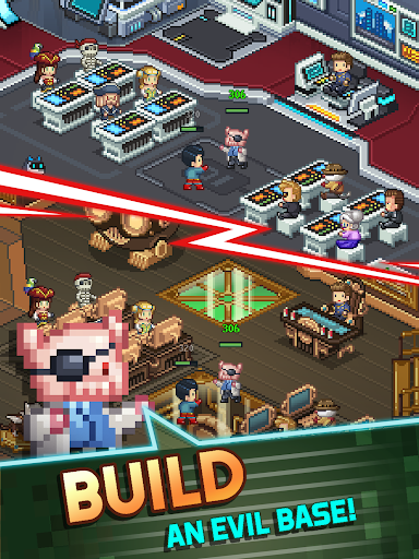 Sewa & latih pelayan anda, melawan penjahat saingan, berniaga di pasar gelap dan tingkatkan asas untuk menjadi HQ jahat paling manis yang pernah dilihat dunia!
