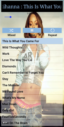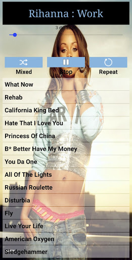 In deze applicatie vindt u de beste nummers en nieuwigheden van Rihanna.Download de gratis applicatie op uw smartphones voor onbeperkte duur en geniet van de beste hits met hoogwaardig geluid en zonder internet.
