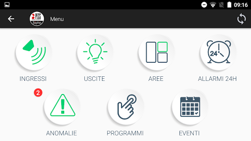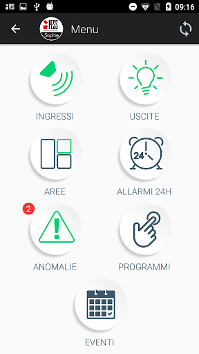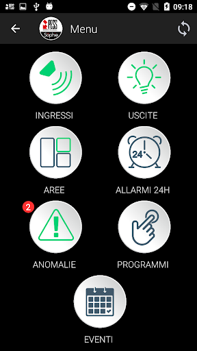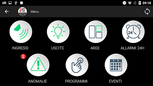 Elk profiel is een Pess Sophie-systeem. Door op een van hen te klikken, wordt het wachtwoord aangevraagd. Door het wachtwoord in te voeren, gevolgd door "OK" in een oogwenk, kunt u het systeem aan. De volgende pagina is "MENU" "en binnen de pictogrammen voor ingangen, uitgangen, gebieden, alarmen, anomalieën, gebeurtenissen en programma's worden weergegeven.