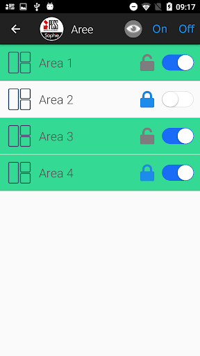 -Aree: status, activering en deactivering, blok en ontgrendel, aan / uit Turveillance.