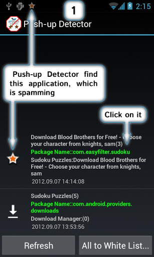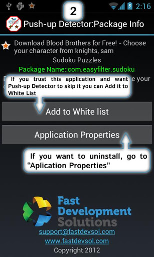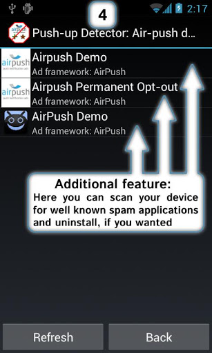 Spam Notifications AirPush Detector protect your deviceAirPush Ads Detector is an Android easytouse utility, which helps to find installed applications that send various annoying notifications from Airpush, Leadbolt, Xapush, Appenda, IAC, MoolahMedia., and others. After detecting , Pushup Detector will suggest to switch to annoying application properties for the further actions, i.e. uninstallation.Unlike other applications that only detect wellknown malware Airpush, Leadbolt, Xapush, Appenda, IAC, MoolahMedia., and others,Pushup Detector will help you to detectthose applications in particular, out of 100200 installed ones, that disturb you with spam. IMPORTATANT: AirPush Detector does not require superuser permissions root. Application is installed as a system service.THIS APPLICATION DOES NOT BLOCK NOTIFICATIONS. It only allows you to find which applications send annoying notifications. In order to get rid of spam, you will have to uninstall yourself applications that spread spam.During the first launch you will be asked to turn on app as a service: it is necessary to switch it on. Push up Detector will be able to perform its functions and help youonly running as a service.What to do in Main:This is the main section of the application. Here you can find the list of applications that had been noticed to be sending notifications and had not been added into White List. If you noticed an icon or notification text, that has been disturbing you, in the list of applications, just press on it and in the popup window choose Application Properties in order to shift to the application properties where you will be able to uninstall it. If you cannot find the needed icon from the list, try to check WhiteList, you could have added application to this list earlier.What is a WhiteList:This is a list of your applications that can send various important notifications. You can modify it on your own. After adding the application to WhiteList, AirPush Detector continues to control it, but will not show it on the main list.AirPush Detector:In this section you will be able to check the device on presence of malicious applications known by AirPush Detector and decided whether uninstall applications or not. If you came up with any questions, you may want to watch a video on http:www.youtube comwatch?vfKuKyrFCWeI or write an email to technical support.