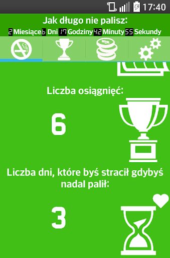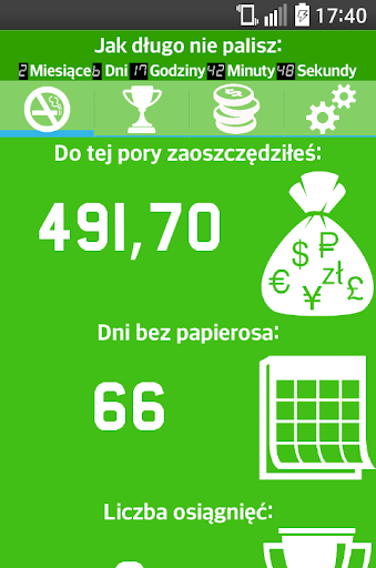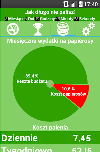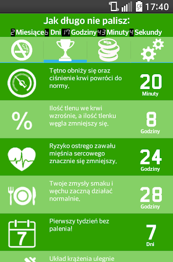 Aplikacja "Rzuć palenie" pokazuje użytkownikowi zalety jakie płyną z rzucenia palenia. Aplikacja umożliwia użytkownikowi wprowadzenie swoich danych, a następnie obserwację zmian oraz odkrywanie zalet wynikających z rzucenia palenia. Aplikacja oblicza czas i zaoszczędzone pieniądze od dnia zaprzestania palenia, oraz przedstawia pozytywne zmiany zachodzące w organizmie osoby która przestała palić. Wszystkie informacje, które przekazywane są użytkownikowi powinny motywować go do pozostania w zdrowym trybie życia, lecz należy pamiętać że wszystko zależy tylko od silnej woli użytkownika. ;)