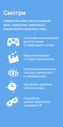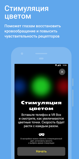 Kolor stymulacji oczu doskonale działa z urządzeniami VR Box. Algorytm w pełni odtwarza działanie urządzenia "Colorithm". Regularne sesje zwiększają czułość receptorów siatkówki, obniżony ciśnienie wewnątrzgały, przywrócić normalny krążenie krwi.