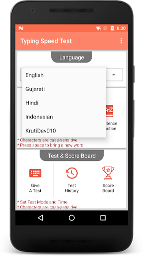 » Fazer um teste - As opções de tempo do teste são de um / dois / cinco / dez minutos ou você pode definir o tempo personalizado. O teste será iniciado depois que você digitar o primeiro caractere do parágrafo mostrado. Use o teste do mestre de digitação e desafie seu amigo para um jogo de teste de digitação.