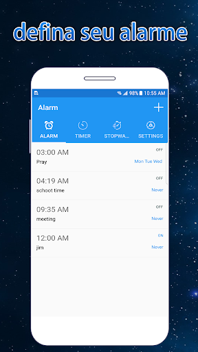 Este aplicativo extremo despertador é livre para usar e quase compatível com todos os tipos de dispositivos. Primeiro, selecione o tom de alarme desejado neste aplicativo de relógio inteligente e defina seu alarme ou lembrete para acordar ou fazer algo pessoal. Nosso aplicativo motivacional despertador fornece-lhe a melhor oportunidade para oferecer suas orações regularmente e pontualidade. Loud alarm app é totalmente gratuito para todos os telemóveis Android. Há tantos toques engraçados de alarme neste aplicativo de alarme inteligente. Neste despertador música definir massagem para cada alarme.