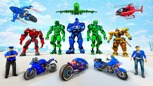 Os jogadores de jogos de moto robô e jogos policiais gostariam de jogar simulador de moto no qual você pode andar e pilotar um jogo de moto policial. No modo de mundo aberto do jogo de bicicleta de robô voador, você vai andar livremente na cidade e voar no céu. Tudo o que você precisa é escolher sua moto policial favorita neste simulador de moto voadora e fazer missões desafiadoras de perseguição de moto policial em jogos de moto policial reais.