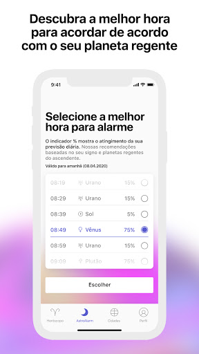 Você sabia que tem seu próprio planeta regente? É Mercúrio, Vênus, Marte, Ceres, Júpiter, Saturno, Urano, Netuno ou Plutão. Podemos determinar a posição do seu regente e de seu signo ascendente do Zodiaco, e prever as fases em que os planetas passarão para ajudá-lo a encontrar o momento certo para dormir e acordar todos os dias! Siga o padrão sugerido e desfrute de um melhor descanso com o Zodiac Astro Alarm.