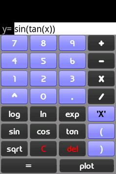 ln,log,sqrt, ,-,/,*,^) and compute the function value at x=0 with the "=" button or plot the function with the "plot" button.