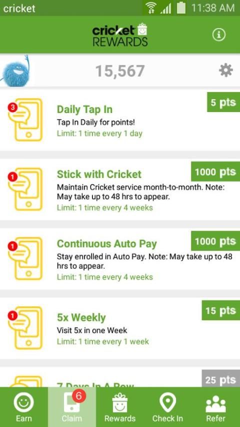 - Заработать и использовать баллы: Когда и где вы хотите, все из вашей ладони! Получите последние и самые большие предложения Cricket, промо прямо со своего смартфона. Зарабатывайте очки для того, когда вы зарегистрируетесь, добавьте строку, подписаться на Auto Pay, принять обследования, играть в игры и многие другие.