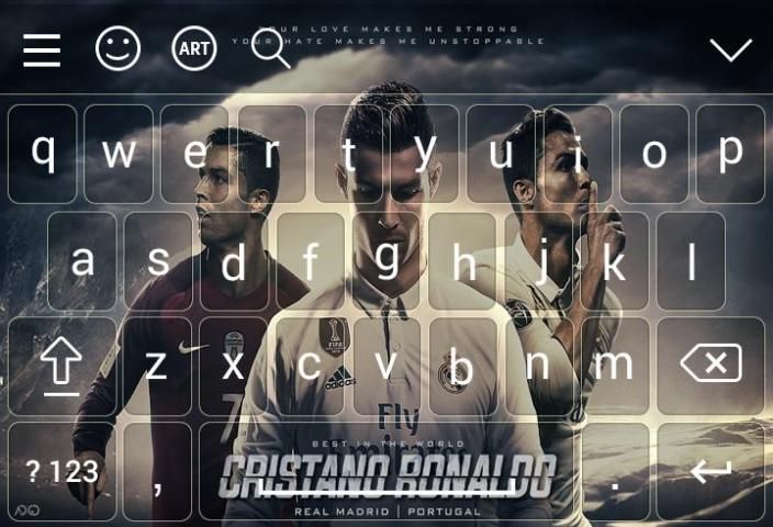 Клавиатура для CR7 реала мадрида клавиатуры применяется в целом изображения телефона и клавиатуры работают как Кристиано Роналдо шрифт в клавиатуре.